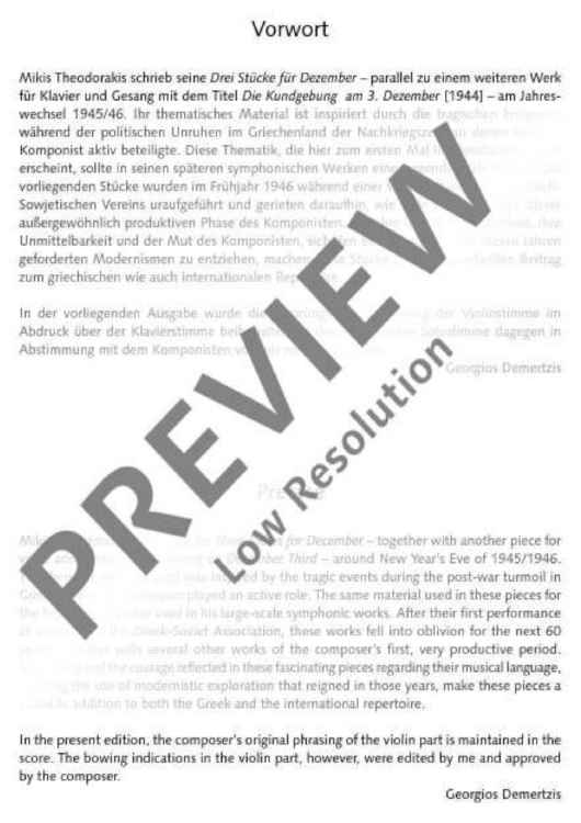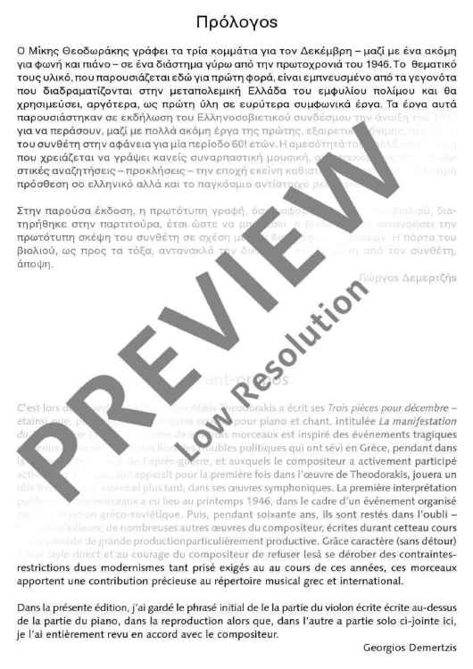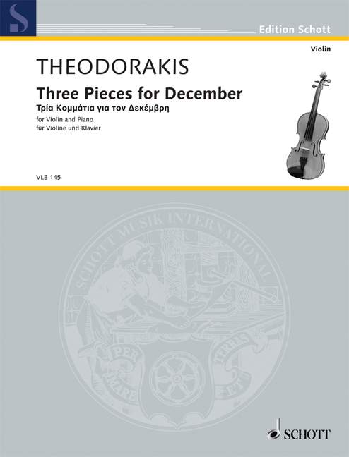 Mikis Theodorakis schrieb seine Drei Stücke für Dezember - parallel zu einem weiteren Werk für Klavier und Gesang mit dem Titel Die Kundgebung am 3. Dezember (1944) - am Jahreswechsel 1945/46. Ihr thematisches Material ist inspiriert durch die tragischen Ereignisse während der politischen Unruhen im Griechenland der Nachkriegszeit, an denen sich der Komponist aktiv beteiligte. Diese Thematik, die hier zum ersten Mal in Theodorakis' Werk erscheint, sollte in seinen späteren symphonischen Werken eine tragende Rolle spielen. Die vorliegenden Stücke wurden im Frühjahr 1946 während einer Veranstaltung des Griechisch-Sowjetischen Vereins uraufgeführt und gerieten daraufhin, wie viele weitere Werke dieser außergewöhnlich produktiven Phase des Komponisten, 60 Jahre lang in Vergessenheit. Ihre Unmittelbarkeit und der Mut des Komponisten, sich den Einengungen der in diesen Jahren geforderten Moderismen zu entziehen, machen diese Stücke zu einem wervollen Beitrag zum griechischen wie auch internationalen Repertoire.