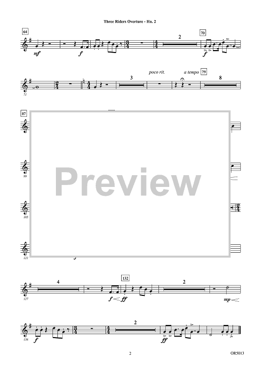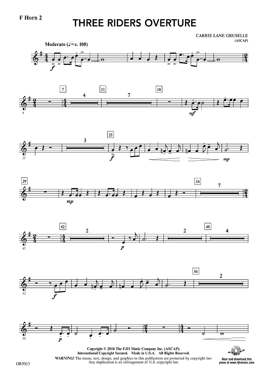 "Three Riders Overture - F Horn 2" Sheet Music by Carrie Lane Gruselle