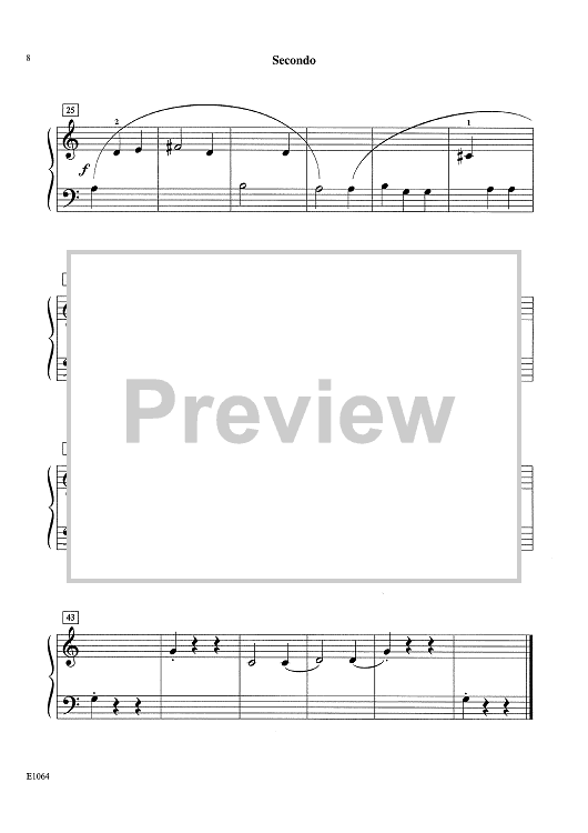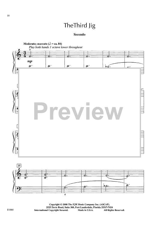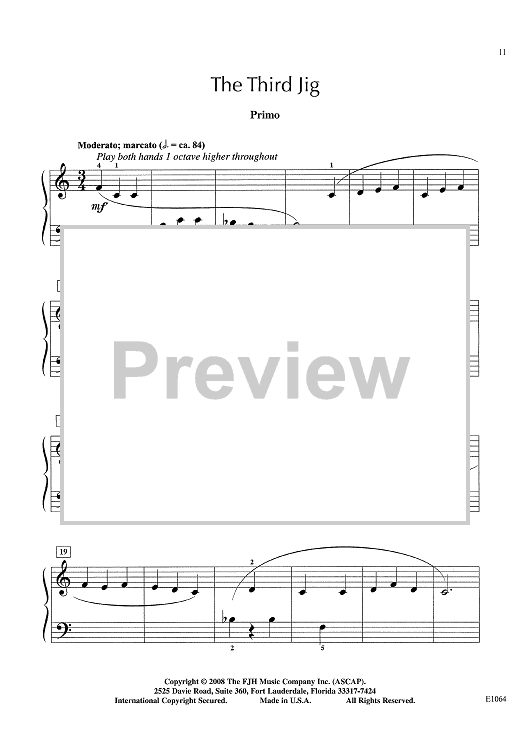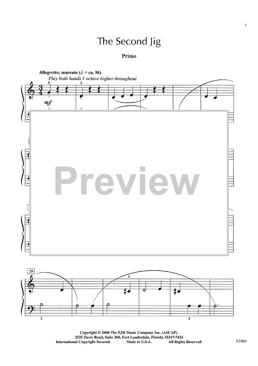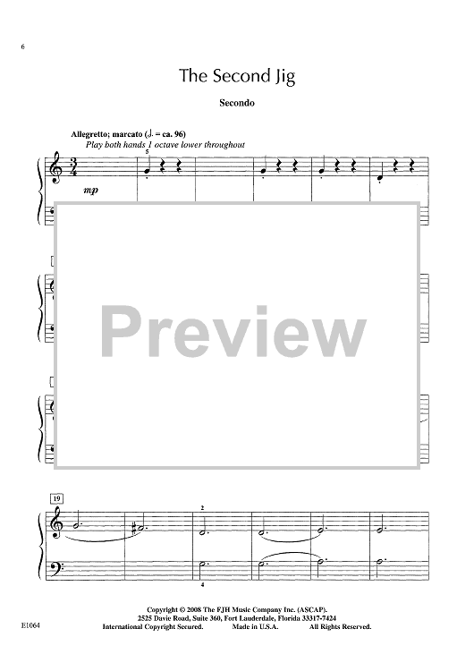 This elementary level collection of jigs is written for one piano, four hands providing the elementary pianist with a cheerful selection of Scottish Jigs from which to choose. Can be performed as an entire group or as individual pieces. Your elementary students will love playing them!