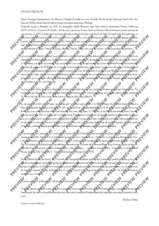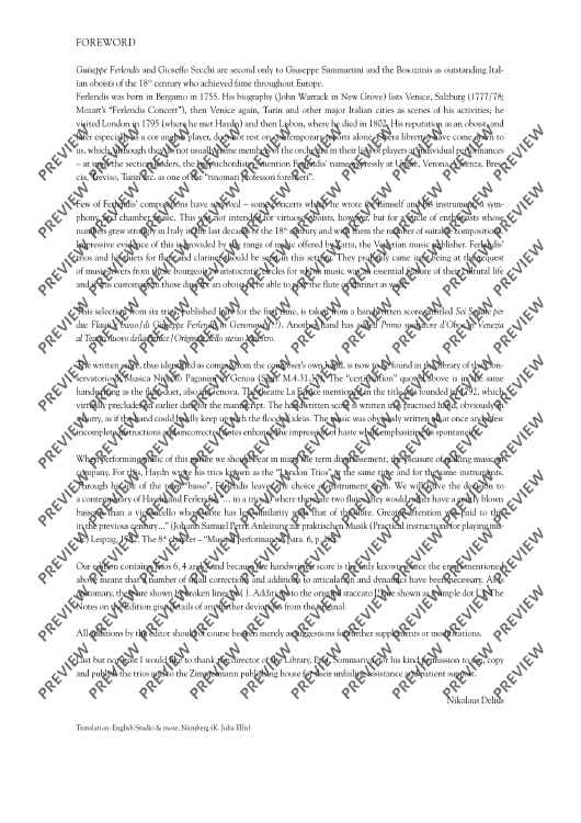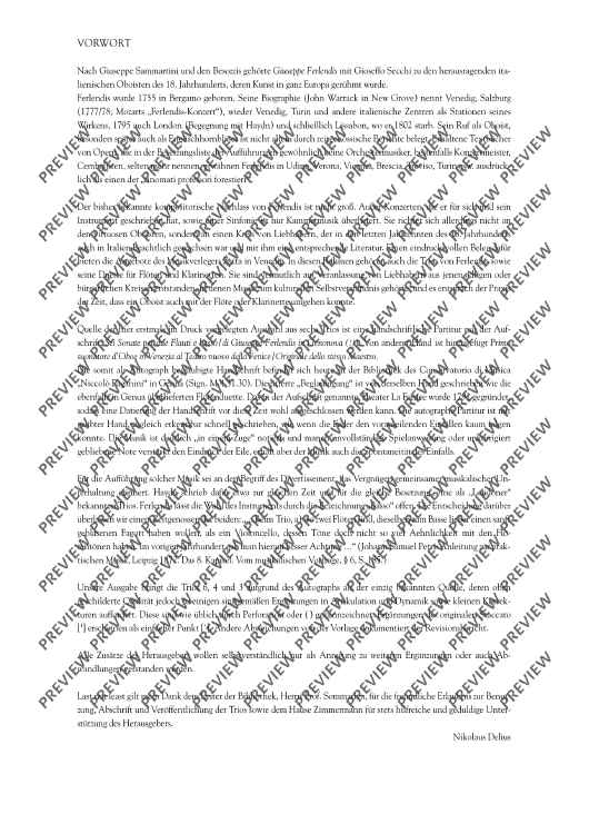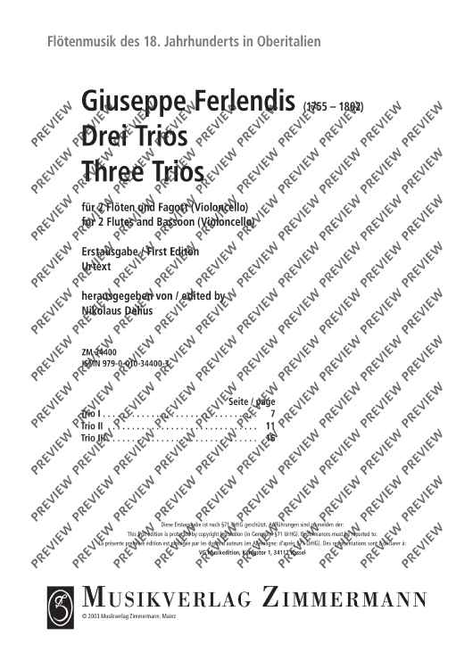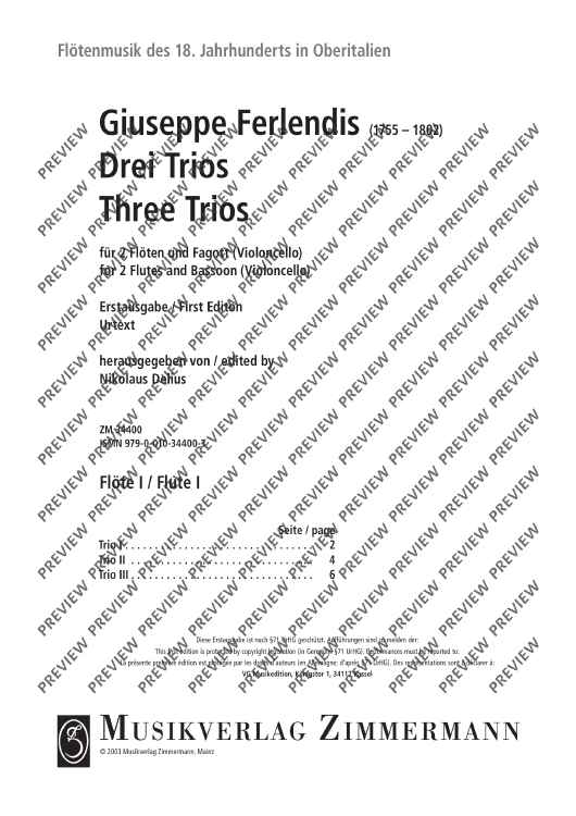 Giuseppe Ferlendis (1755-1802) was one of the leading oboists in his time. Although he mainly wrote chamber music, these compositions were not meant for virtuoso oboists, but rather for a circle of enthusiasts whose demand for literature was enormous. It went without saying that every oboist was also familiar with the flute and the clarinet. The trios presented here are cheerful pieces of intermediate difficulty meant for entertainment.