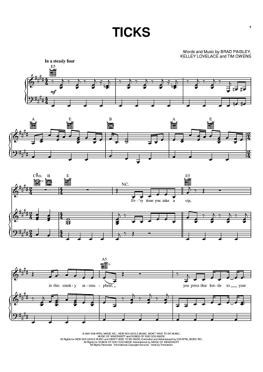 Digital Sheet Music for Ticks by Kelley Lovelace, Tim Owens, Brad Paisley scored for Piano/Vocal/Chords; id:396728