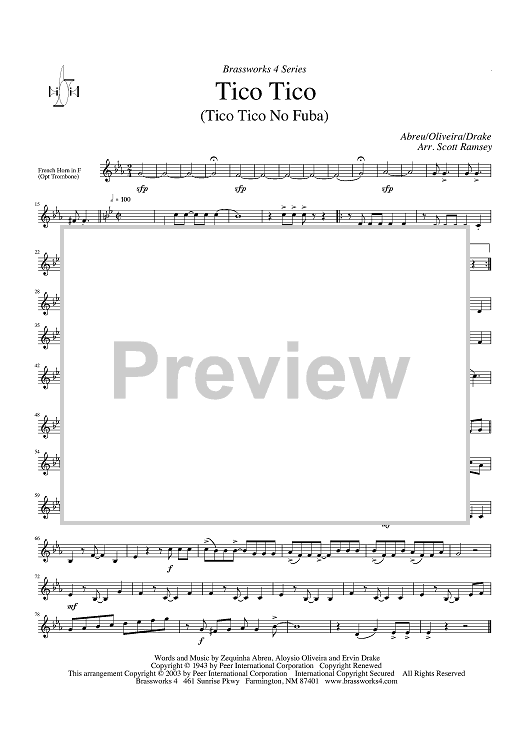 Digital Sheet Music for Tico Tico - Alt. French Horn in F by Ervin Drake, Zequinha Abreu, Aloysio Oliveira, Scott Ramsey scored for Brass Quartet; id:410228