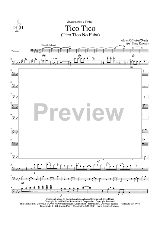 Digital Sheet Music for Tico Tico - Trombone by Ervin Drake, Zequinha Abreu, Aloysio Oliveira, Scott Ramsey scored for Brass Quartet; id:410226