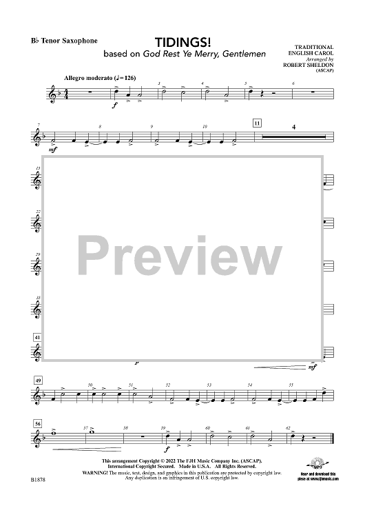 Digital Sheet Music for Tidings! - Bb Tenor Sax by Traditional English Carol, Robert Sheldon scored for Concert Band; id:498463