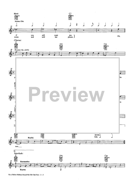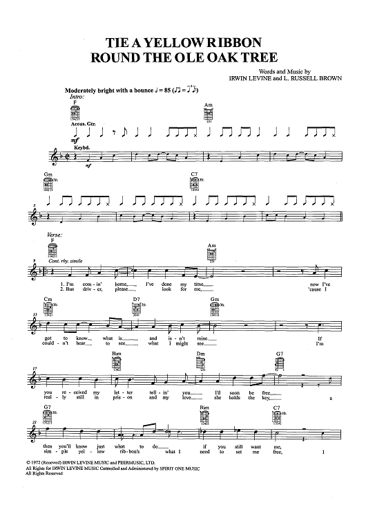 Digital Sheet Music for Tie A Yellow Ribbon Round The Ole Oak Tree by Irwin Levine, L. Russell Brown, Dawn scored for Easy Guitar Tab/Vocal/Chords; id:458982