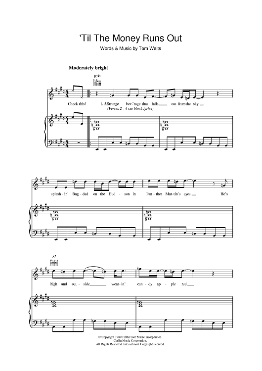Digital Sheet Music for 'Til The Money Runs Out by Tom Waits scored for Piano/Vocal/Chords; id:397978