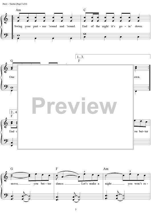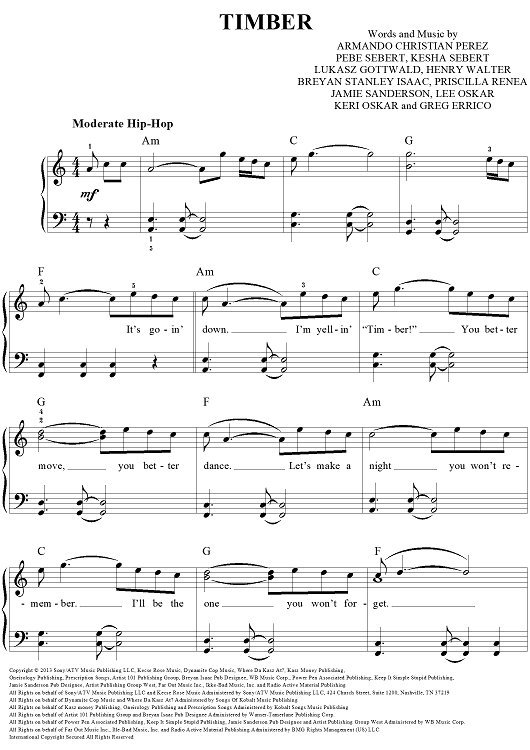 Digital Sheet Music for Timber by Lee Oskar, James Sanderson, Kesha Sebert, Lukasz Gottwald, Pebe Sebert, Pitbull, Priscilla Renea, Henry Walter, Armando Christian Perez, Breyan Stanley Isaac, Keri Oskar, Greg Errico scored for Easy Piano/Vocal/Chords; id:447336