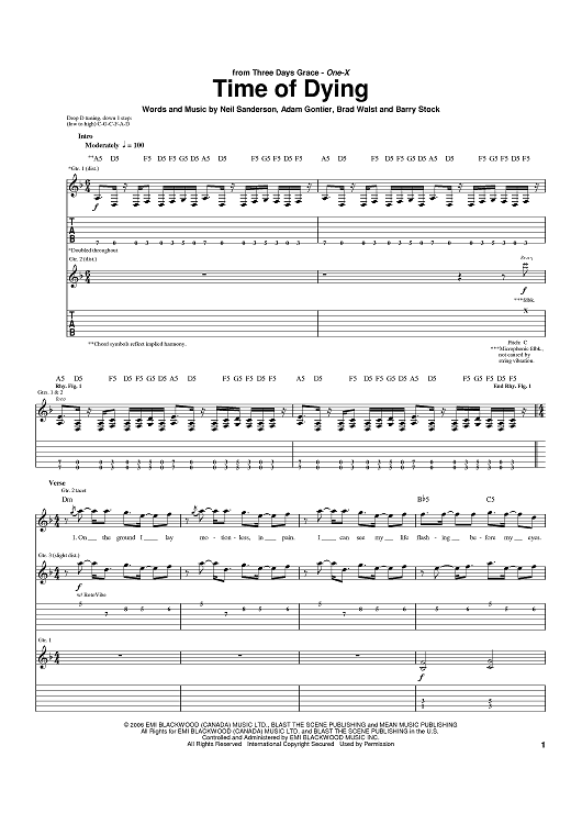 Digital Sheet Music for Time Of Dying by Neil Christopher Sanderson, Adam Gontier, Brad Walst, Three Days Grace, Barry Stock scored for Guitar Tab; id:394533