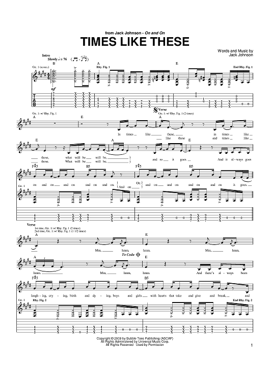 Digital Sheet Music for Times Like These by Jack Johnson scored for Guitar Tab; id:373178