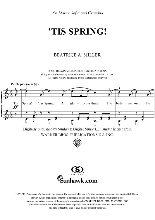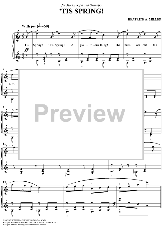 Digital Sheet Music for 'Tis Spring! by Beatrice A. Miller scored for Piano/Vocal; id:292736