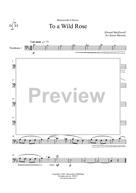 Digital Sheet Music for To A Wild Rose - Trombone 1 by Karen Marston, Edward MacDowell scored for Brass Quartet; id:411304