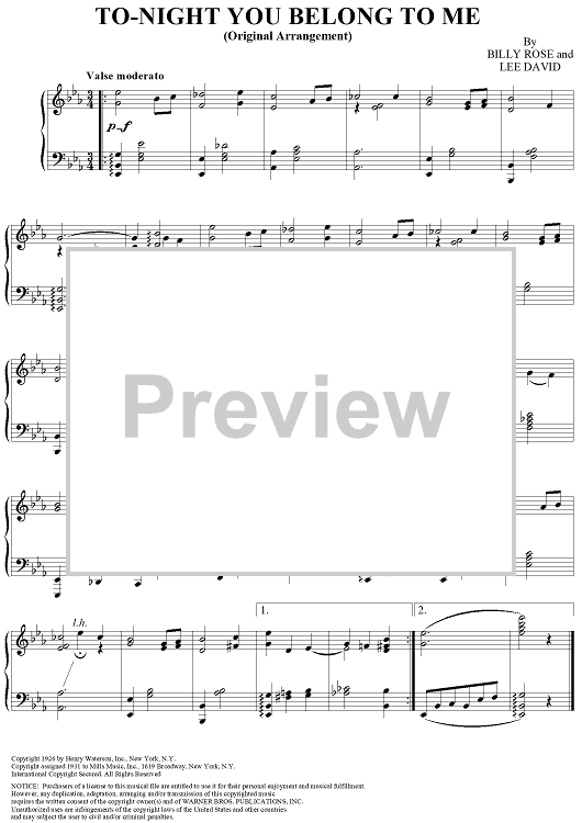 Digital Sheet Music for To-Night You Belong to Me (Original Arrangement) by Fats Waller, Billy Rose, Lee David scored for Piano Solo; id:316636