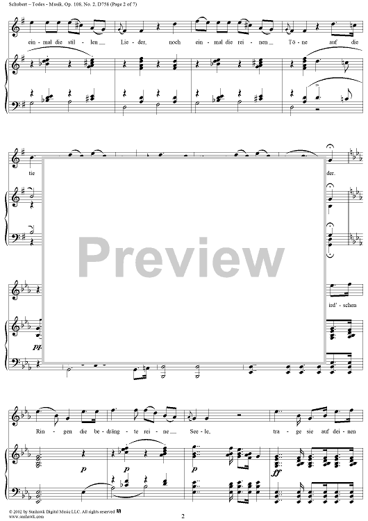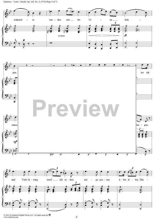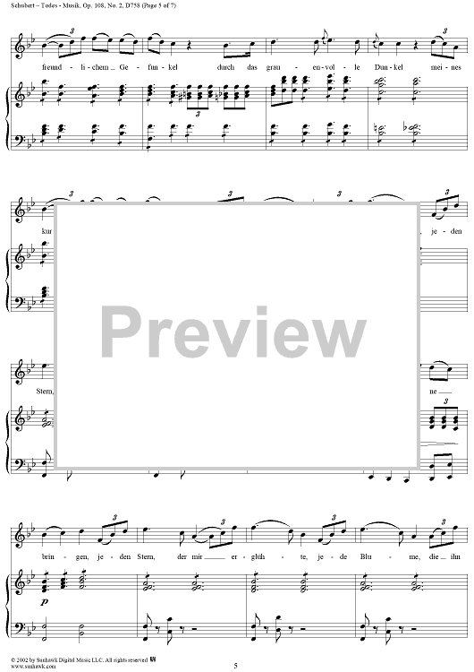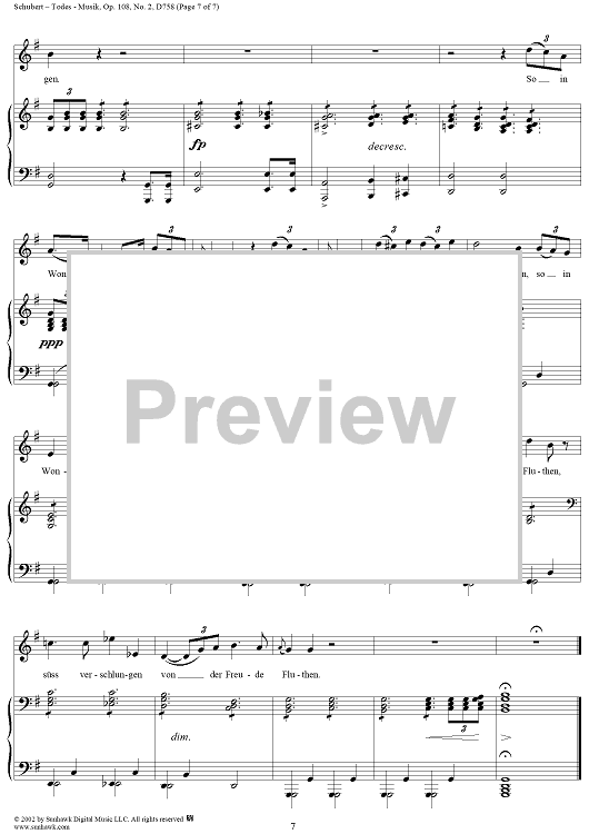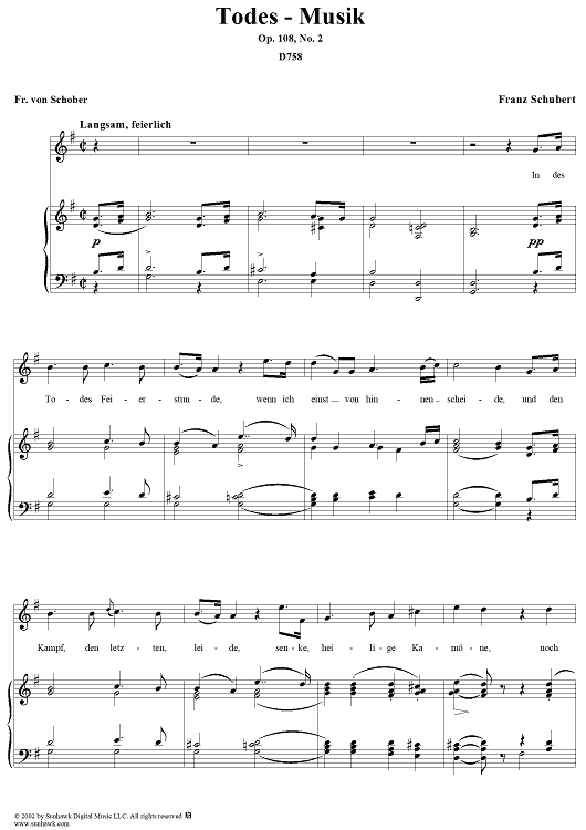 Digital Sheet Music for Todesmusik, Op. 108, No. 2, D758 by Franz Schubert scored for Voice/Piano; id:256654