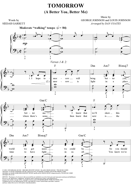 Digital Sheet Music for Tomorrow by Dan Coates, Siedah Garrett, George Johnson, Louis Johnson scored for Easy Piano/Vocal; id:284590