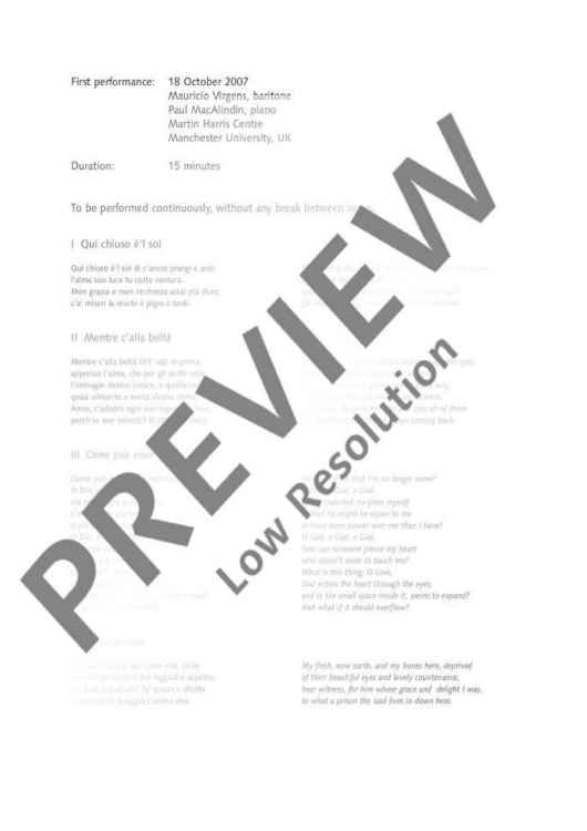 Opening simply with a solo voice, Sir Peter Maxwell Davies' Italian settings of eight poems by Renaissance artist Michelangelo for baritone and piano take both the performers and audience on a striking journey through Michelangelo’s tortured and knotty Tuscan poetry. The piano is introduced in the second of the eight settings punctuating the vocal part with a variety of different textures from bell-like figuration to turbulent virtuosity.