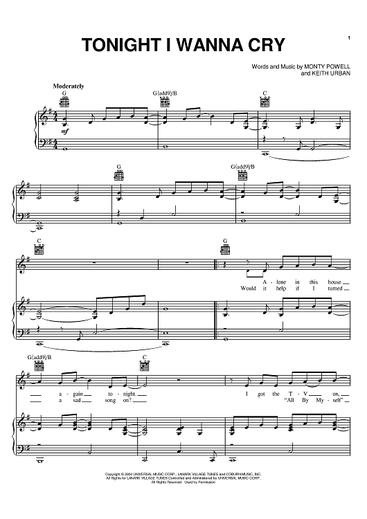 Digital Sheet Music for Tonight I Wanna Cry by Monty Powell, Keith Urban scored for Piano/Vocal/Chords; id:388282