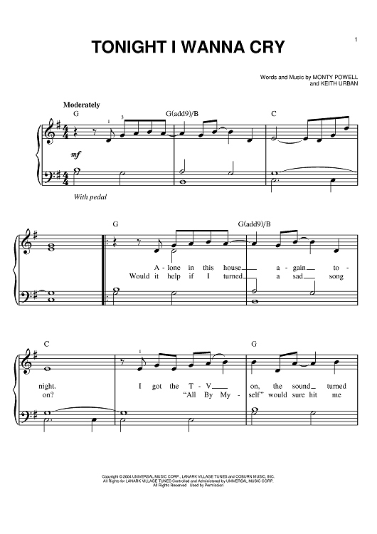 Digital Sheet Music for Tonight I Wanna Cry by Monty Powell, Keith Urban scored for Easy Piano; id:391950