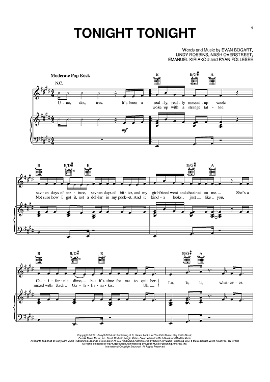 Digital Sheet Music for Tonight Tonight by Lindy Robbins, Emanuel Kiriakou, Evan Bogart, Hot Chelle Rae, Nash Overstreet, Ryan Follesee scored for Piano/Vocal/Chords; id:428751