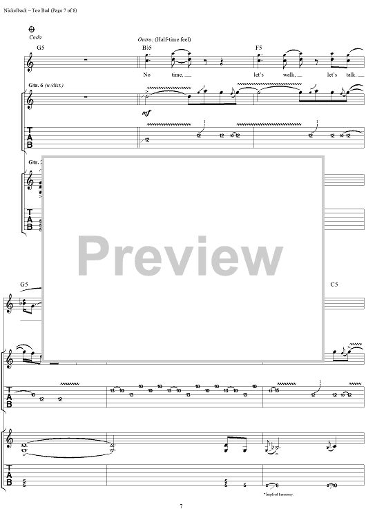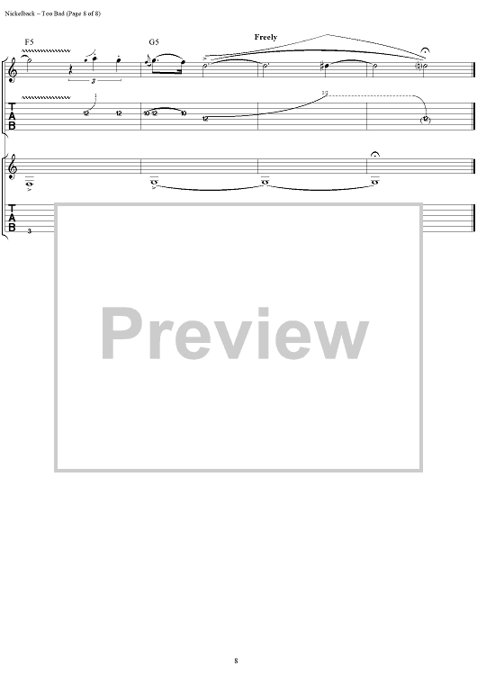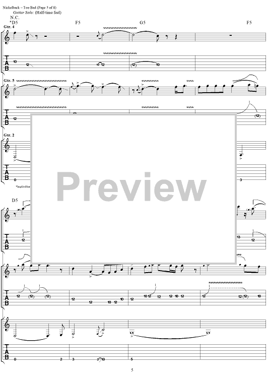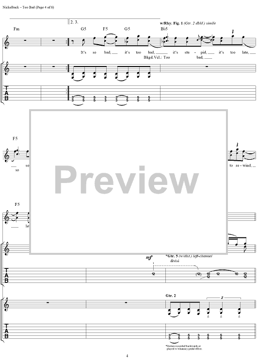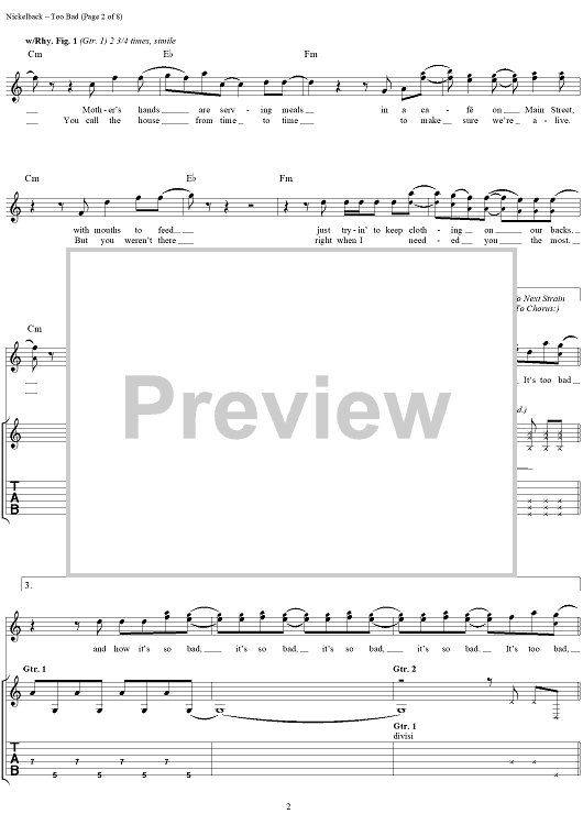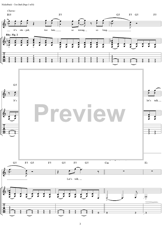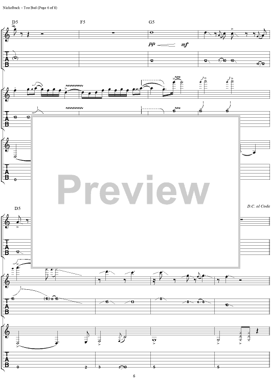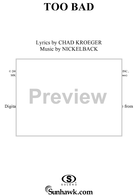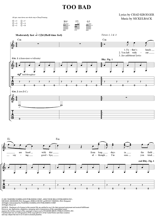 Digital Sheet Music for Too Bad by Nickelback, Chad Kroeger scored for Guitar Tab/Vocal; id:287810