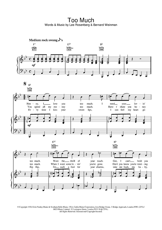 Digital Sheet Music for Too Much by Elvis Presley scored for Piano/Vocal/Chords; id:375776