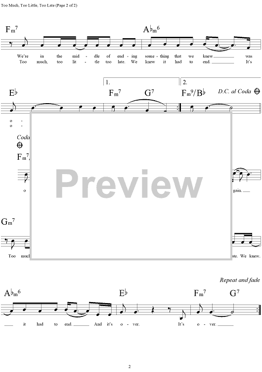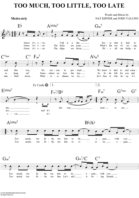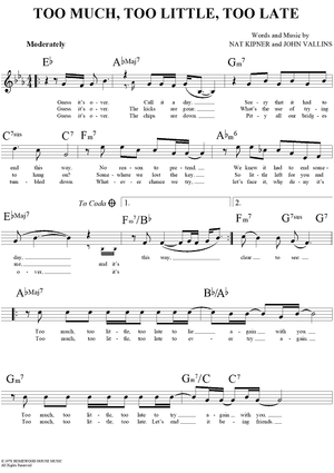 Digital Sheet Music for Too Much, Too Little, Too Late by Johnny Mathis, Nat Kipner, John Vallins, Deniece Williams scored for Lead Sheet; id:113072