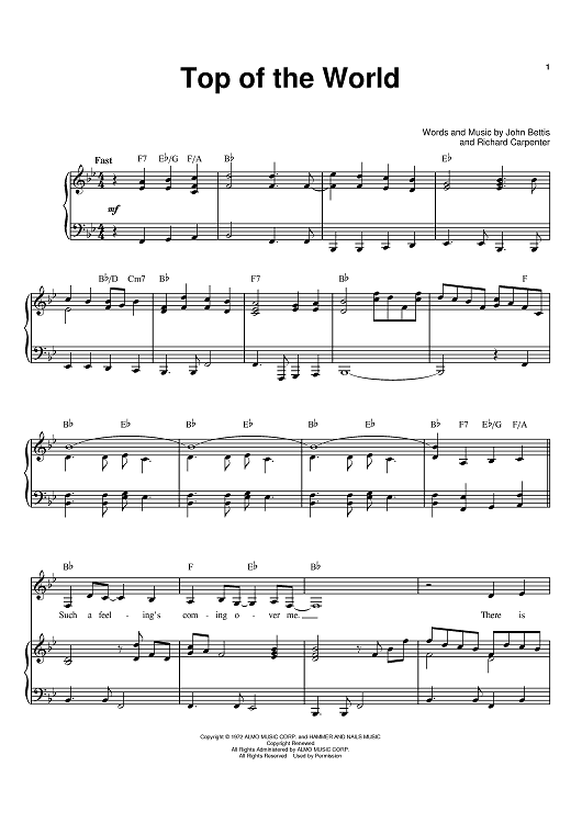 Digital Sheet Music for Top Of The World by The Carpenters, Richard Carpenter, John Bettis scored for Piano/Vocal/Chords; id:371114