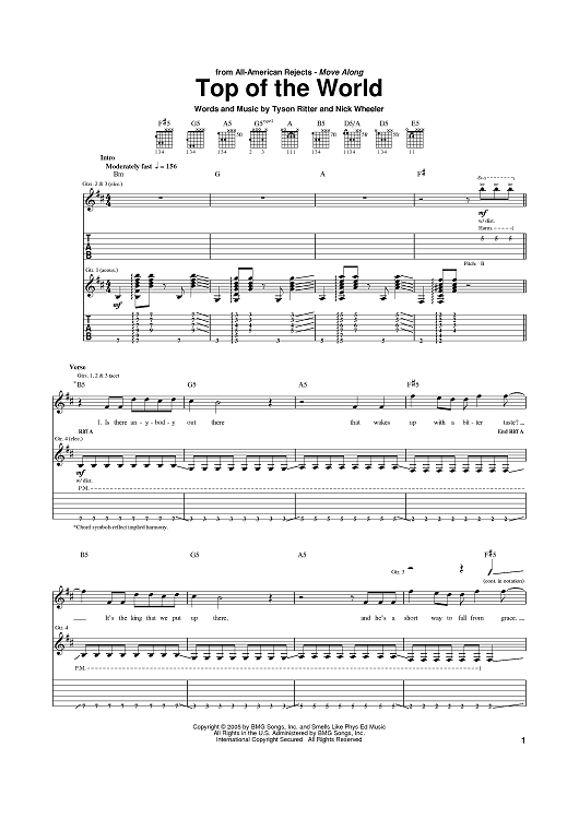 Digital Sheet Music for Top Of The World by Tyson Ritter, Nick Wheeler scored for Guitar Tab; id:388184