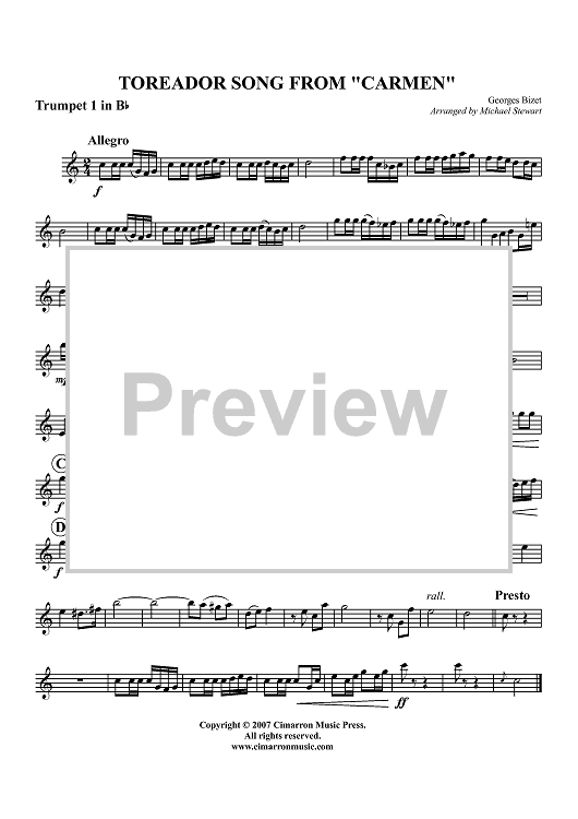 Digital Sheet Music for Toreador Song from "Carmen" - Trumpet 1 in B-flat by Georges Bizet, Michael Stewart scored for Brass Quintet; id:362872