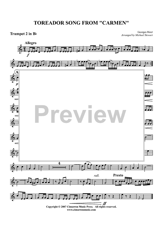 Digital Sheet Music for Toreador Song from "Carmen" - Trumpet 2 in B-flat by Georges Bizet, Michael Stewart scored for Brass Quintet; id:362873