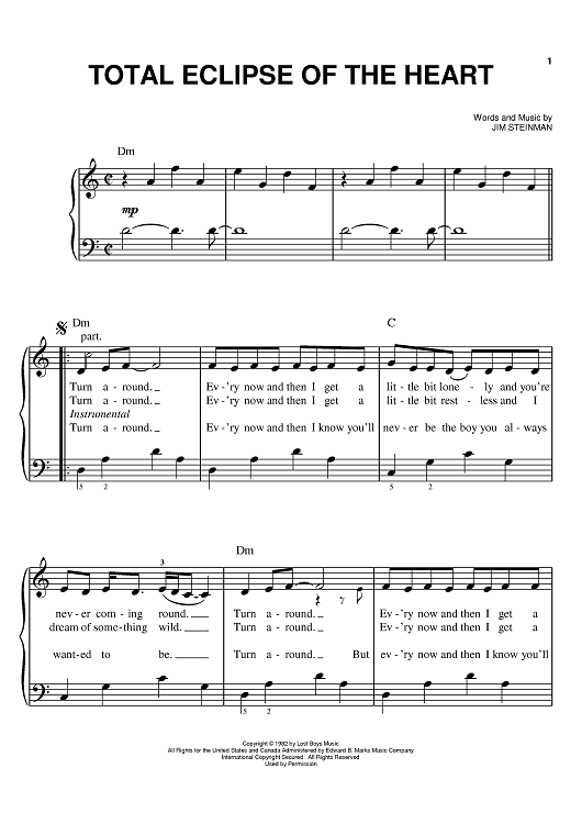 Digital Sheet Music for Total Eclipse Of The Heart by Jim Steinman, Bonnie Tyler, Nicki French scored for Easy Piano; id:371505