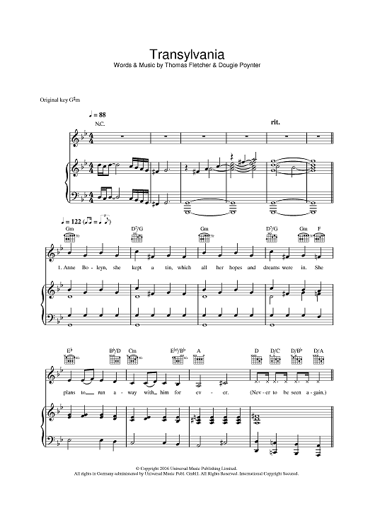 Digital Sheet Music for Transylvania by Tom Fletcher, McFly, Dougie Poynter scored for Piano/Vocal/Chords; id:395729
