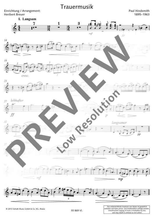 Since the last movement of this piece, which is perhaps the most beautiful of Hindemith's pieces, is a chorale, a version for string instrument plus organ is the obvious work to publish. Thus, 'Trauermusik' can now be performed in churches as well. Versions of 'Trauermusik' for viola or violin or violoncello with piano have been available for quite some time. Now, organists too can include this famous and moving music in their repertoire.