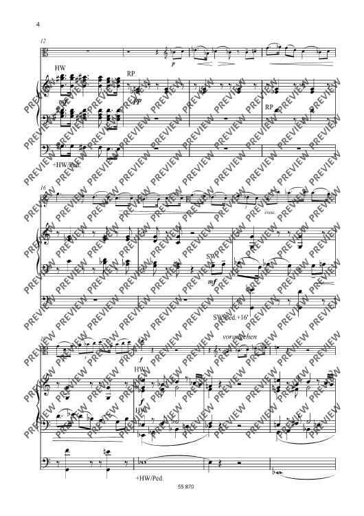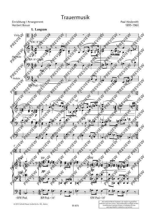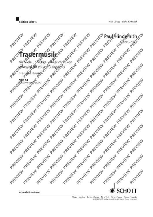 Since the last movement of this piece, which is perhaps the most beautiful of Hindemith's pieces, is a chorale, a version for string instrument plus organ is the obvious work to publish. Thus, 'Trauermusik' can now be performed in churches as well. Versions of 'Trauermusik' for viola or violin or violoncello with piano have been available for quite some time. Now, organists too can include this famous and moving music in their repertoire.