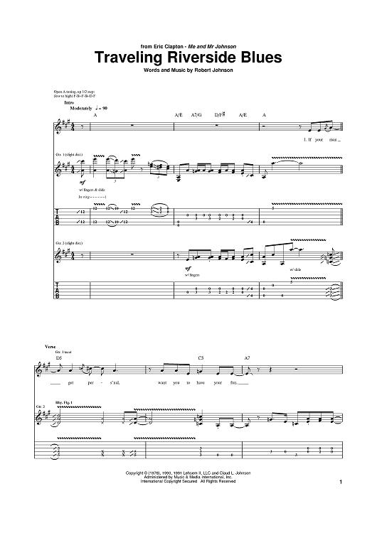 Digital Sheet Music for Traveling Riverside Blues by Eric Clapton, Robert Johnson scored for Guitar Tab; id:374930
