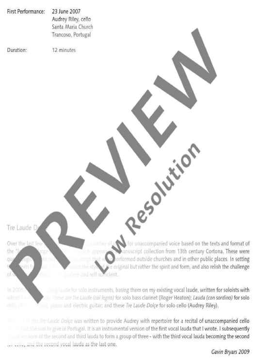 In addition to Bryars' many vocal laude there are a growing number of connected instrumental works. Tre Laude Dolçe for solo cello is the second of these to be released as a Schott Edition publication and follows Bryars' Lauda (con sordino) originally for cello and piano. Based on the same principals as the composer's vocal laude and as always, attempting to retain the purity and austerity of the original form, Tre Laude Dolçe is characterised by long phrases and open structures; a beautiful work perfect for any good cellist.