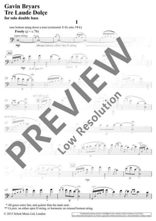 Originally for solo cello, "Tre Laude Dolçe" is characterised by long phrases and open structures; a beautiful work perfect for any good bassist.