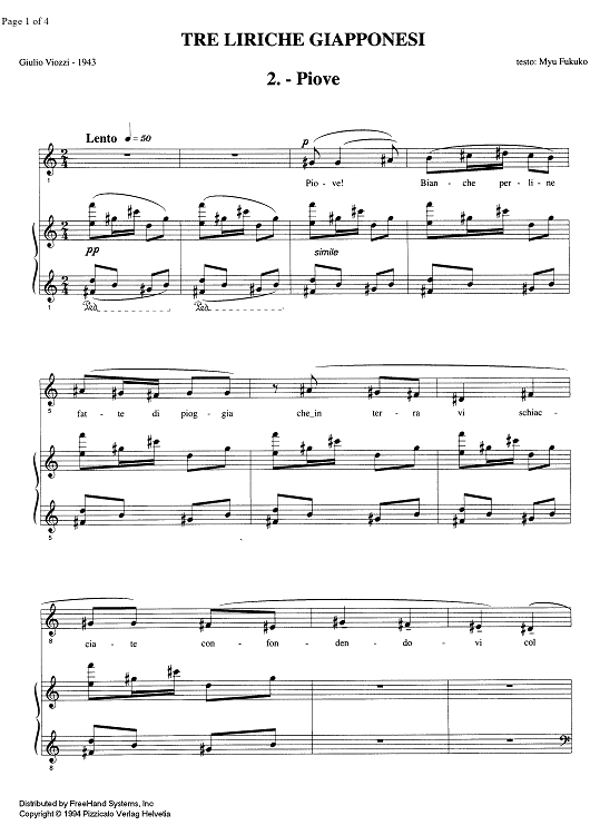Digital Sheet Music for Tre Liriche Giapponesi No. 2 - Piove by , Giulio Viozzi scored for Soprano or Tenor/Piano; id:334400
