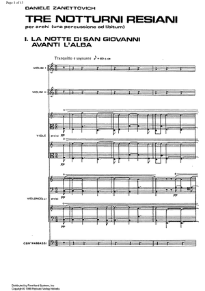 Digital Sheet Music for Tre notturni resiani - Score by Daniele Zanettovich scored for Strings/Percussion; id:354265