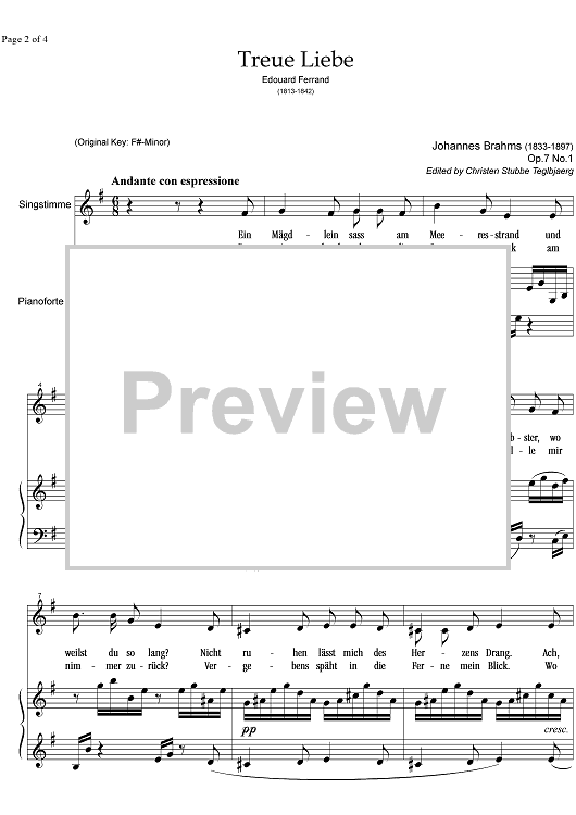Digital Sheet Music for Treue Liebe Op. 7 No. 1 by , Johannes Brahms scored for Mezzo-soprano or Baritone/Piano; id:332812
