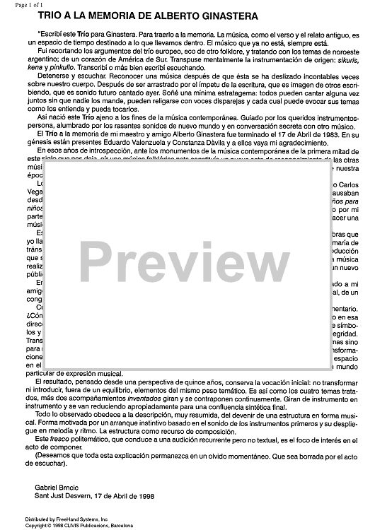 Digital Sheet Music for Trio a la memnoriade Alberto Ginastera - Preface by , Gabriel Brncic scored for Preface; id:353464