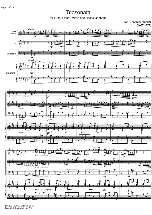 Digital Sheet Music for Trio Sonata D Major - Score by Johann Joachim Quantz scored for Flute or Oboe/Violin/Continuo; id:330460