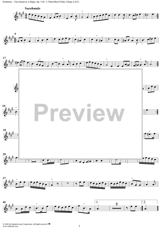 Digital Sheet Music for Trio Sonata in A Major, Op. 3 No. 5 - Flute/Oboe/Violin 2 by Jacques Martin Hotteterre scored for Trio Sonata; id:266285