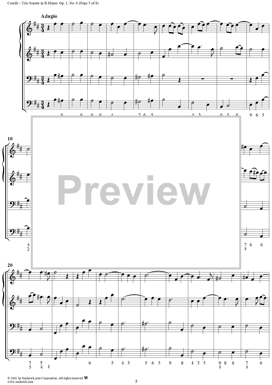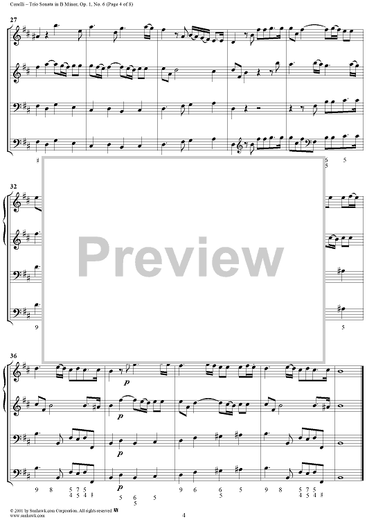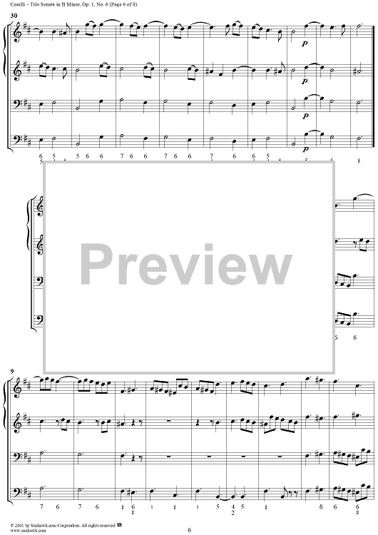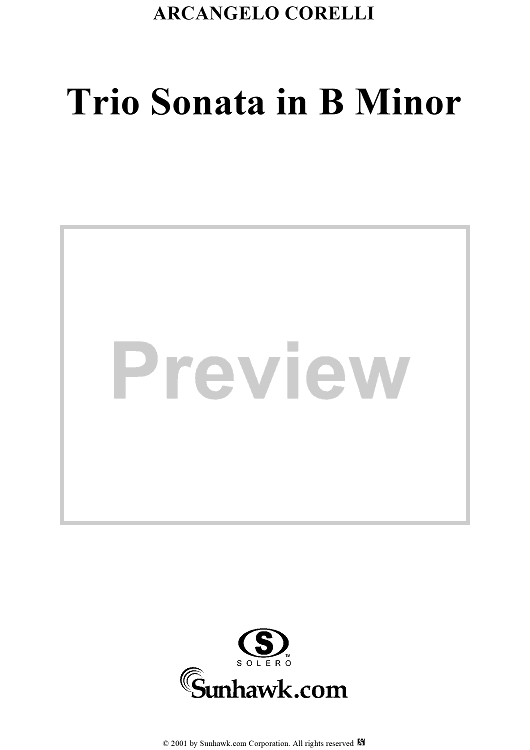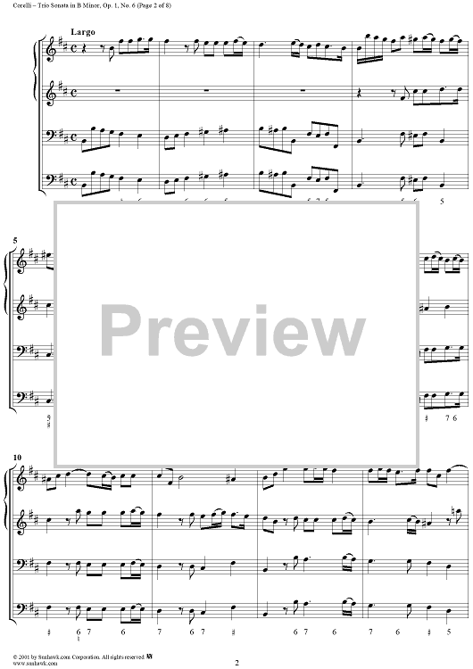 Digital Sheet Music for Trio Sonata in B Minor, Op. 1, No. 6 by Arcangelo Corelli scored for Two Violins, Cello and Organ; id:272414