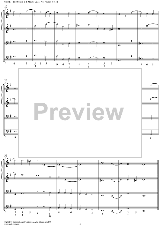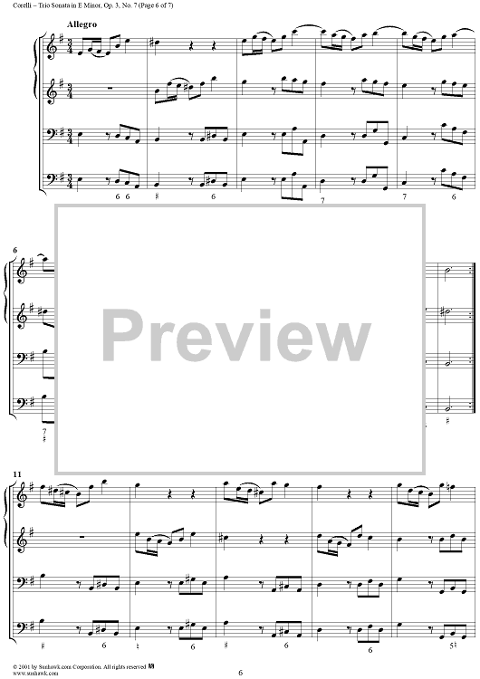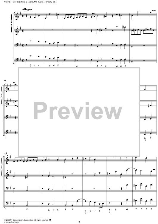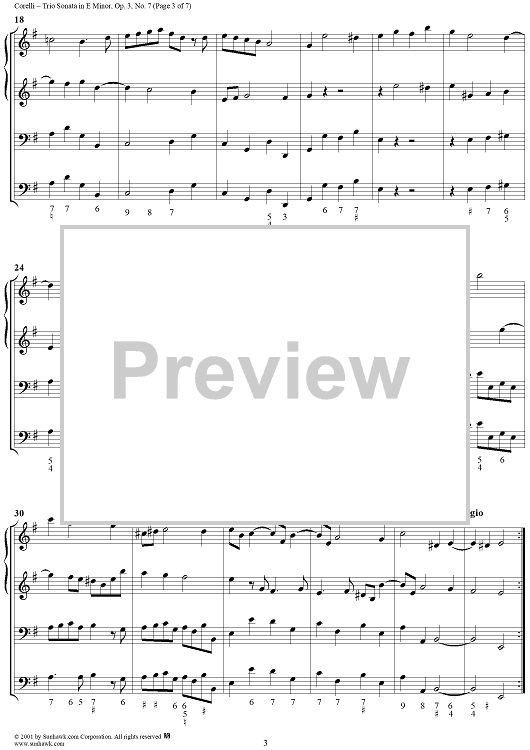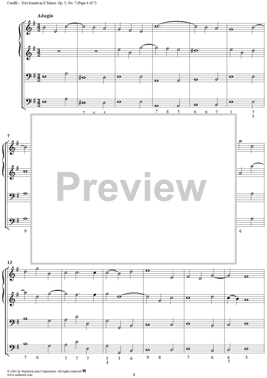 Digital Sheet Music for Trio Sonata in E Minor, Op. 3, No. 7 by Arcangelo Corelli scored for Two Violins, Cello and Organ; id:272421