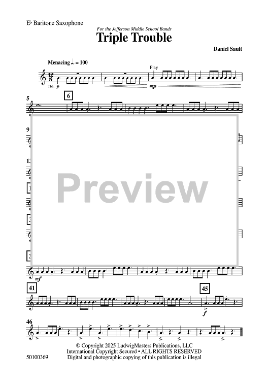 Digital Sheet Music for Triple Trouble - Eb Baritone Saxophone by Daniel Sault scored for Concert Band; id:509405