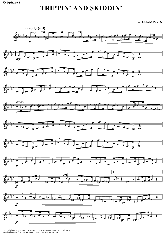 Digital Sheet Music for Trippin' And Skiddin' - Xylophone 1 by , William Dorn scored for Xylophones/Piano; id:419211