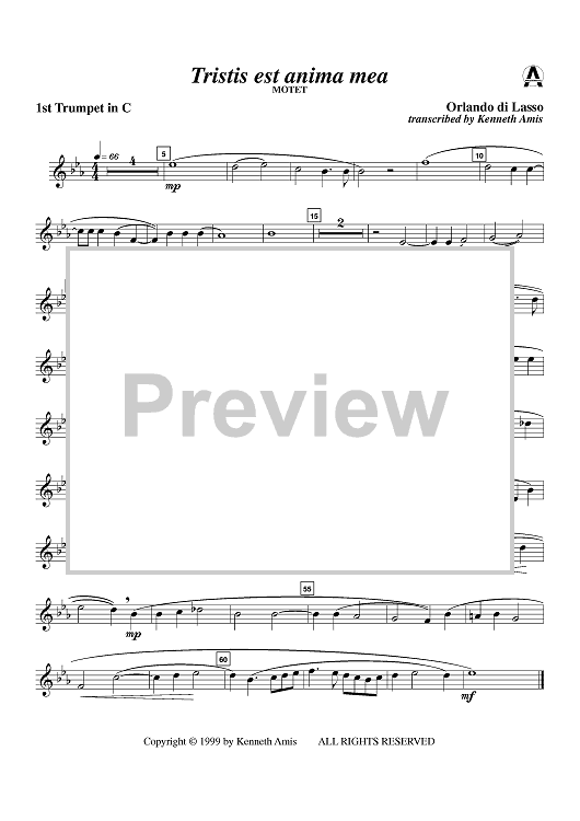 Digital Sheet Music for Tristis est anima mea - Trumpet 1 in B-flat by Orlando de Lassus, Kenneth Amis scored for Brass Quintet; id:404121