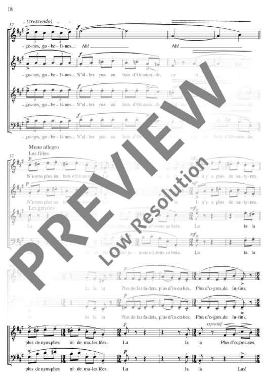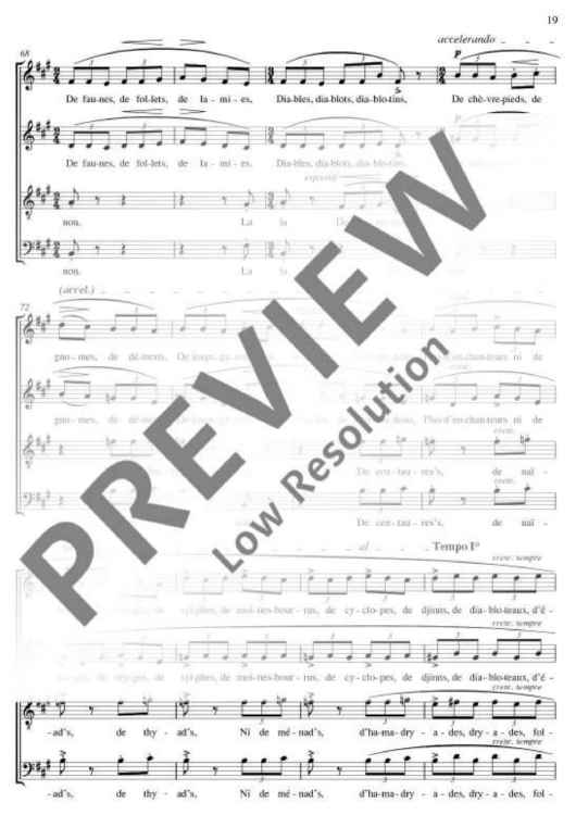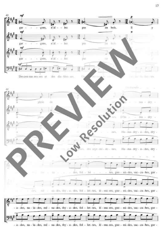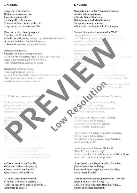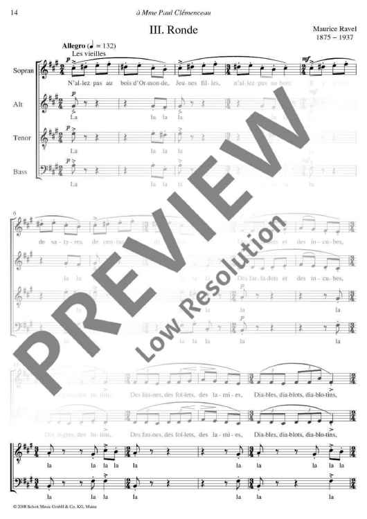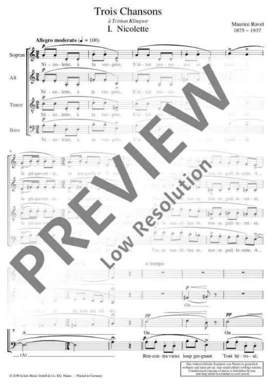 Revised edition of the famous choral songs by the composer of 'Bolero'. This cycle, too, is designed for a great climax. 'Nicolette' describes a simple, almost naïve fairy-tale character. The solos of the middle movement in the style of a sarabande can be performed by members of the choir. The final 'Rondo' is highly virtuoso, with an abundance of allusions to ancient mythological figures. This cycle is the ideal complement to the chansons by Claude Debussy (SKR 19006) or the French chansons by Paul Hindemith (C 43782).