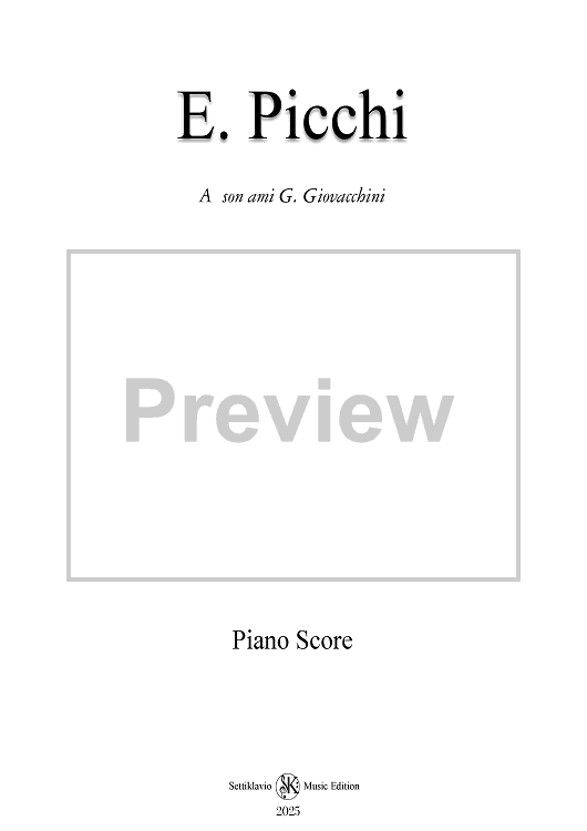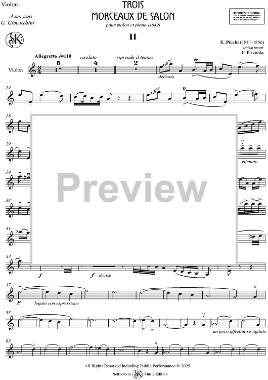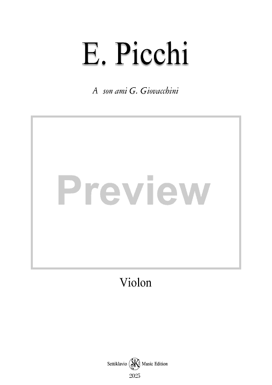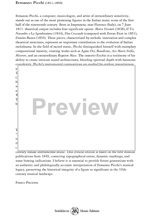 This is the second of three works for violin and piano titled "Morceaux de Salon", dedicated to G. Giovacchini, one of the most distinguished students of Ferdinando Giorgetti, the renowned violinist, composer, and professor at the Academy of Fine Arts in Florence, Italy. These chamber music compositions are characterized by their elegance and refinement, representing the style of early 19thcentury Italian instrumental music. This critical edition is based on the first musical publications from 1849, correcting typographical errors, dynamic markings, and some bowing indications. I believe it is essential to provide future generations with an authentic and philologically accurate interpretation of Ermanno Picchi's musical legacy, preserving the historical integrity of a figure so significant in the 19th century musical landscape.