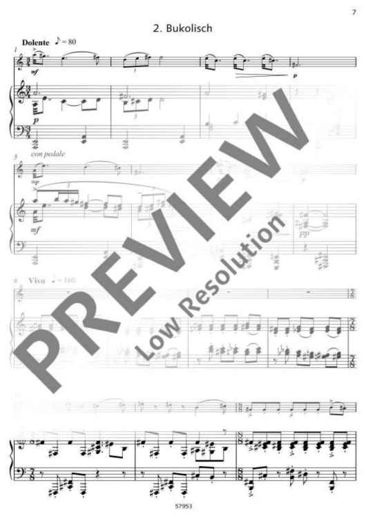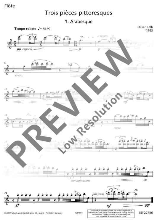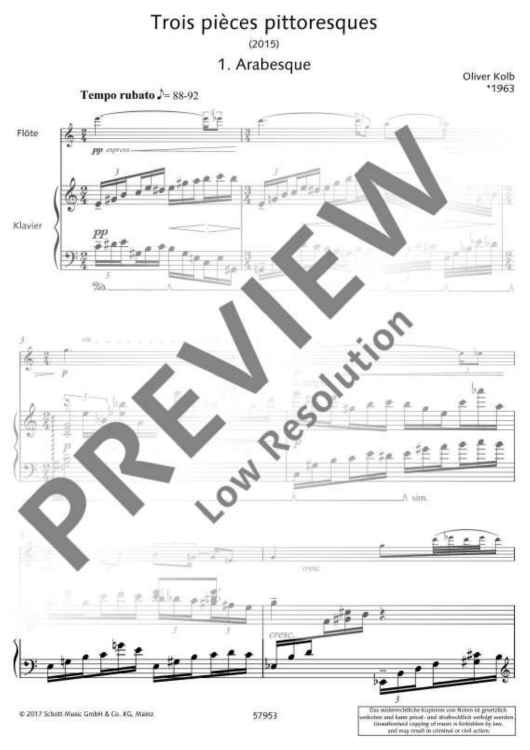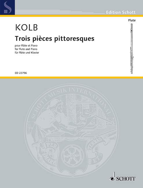 Trois pièces pittoresques is written entirely in French timbres. Its main features are the ease and joy of playing for the performers. This work by the pianist Oliver Kolb from Darmstadt won the second prize at the Harald Genzmer Composition Competition 2016. A challenging performance piece that is ideal for performances at concerts and competitions.